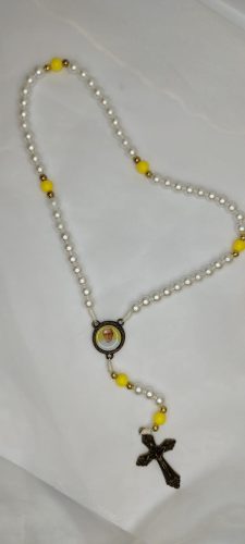Terço em pérola 8mm nas dimensões de 39cm com entremeio resinado foto Padre Aloísio